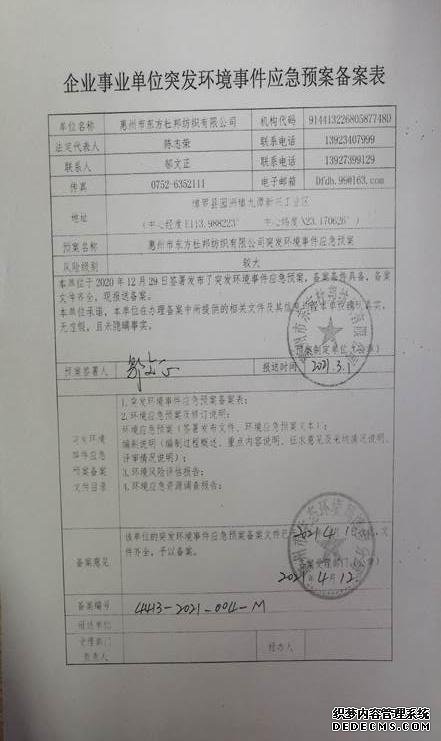已制訂《惠州市東方杜邦紡織有限公司環(huán)境風(fēng)險評估報告》,并于2021年4月12日上報博羅縣環(huán)境保護局備案;